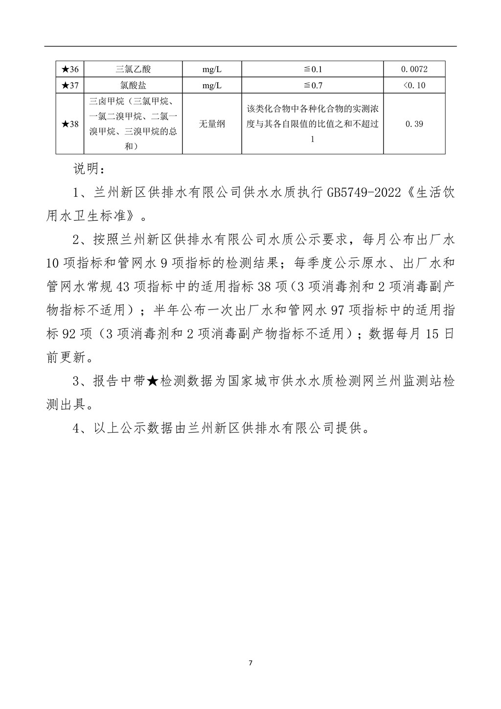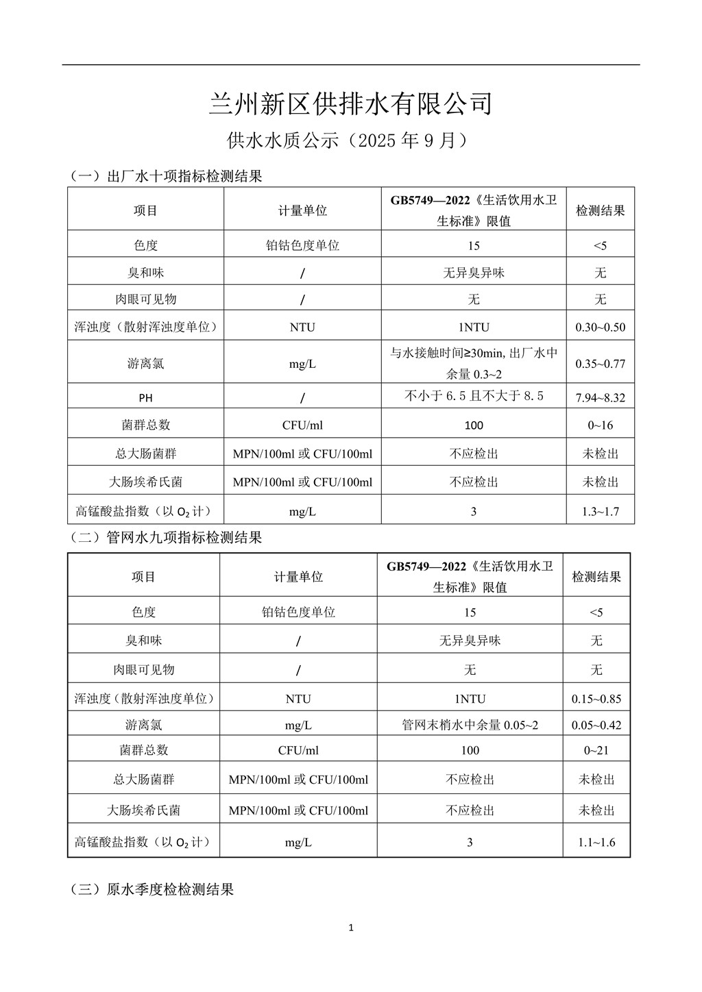 (2025年9月)蘭州新區(qū)供排水有限公司供水水質(zhì)公示